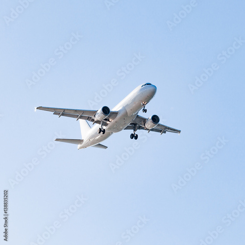 white airplane on a blue background. airplane in the sky