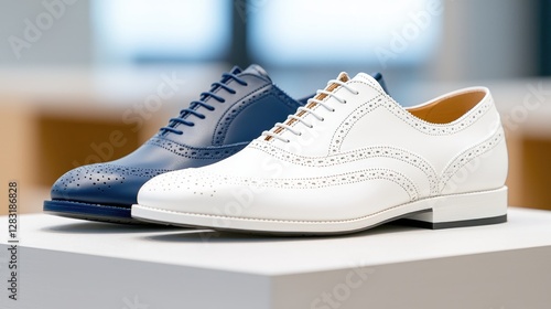 White and blue men's leather shoes on display