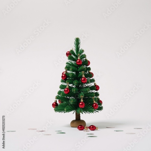 White background adorned with green confetti and red ornaments around a miniature Christmas tree