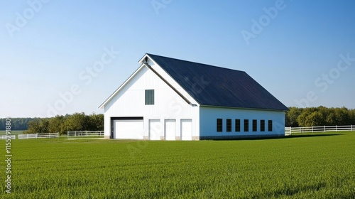White Barn Surrounded by Lush Green Fields and Clear Blue Sky