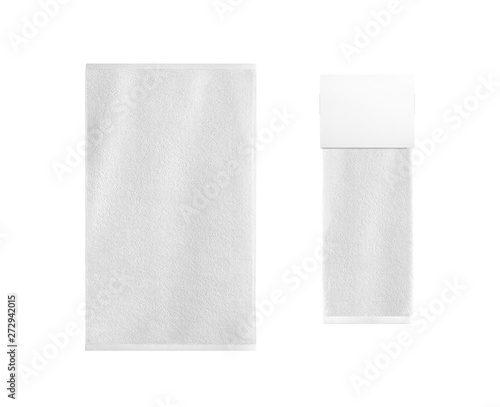 White bath textile items set isolated. Empty retail hanger with folded terry towel.