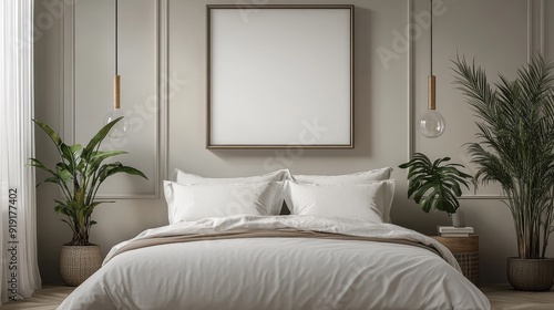 White Bed with Pillows, Blank Canvas, and Plants in a Modern Bedroom