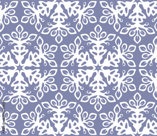 White blue lace seamless pattern design. Graphic background with snowflake elements. Floral repetitive boho illustration. Winter wallpaper art.