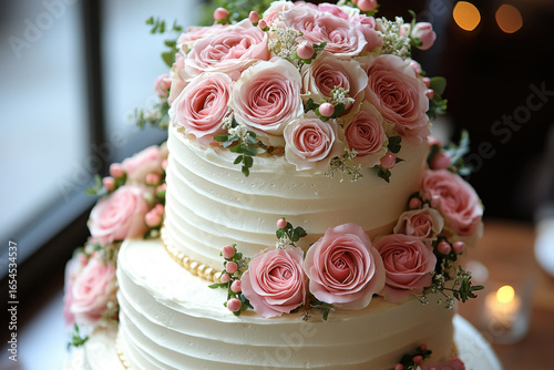 White cake with pink roses on top.