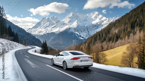 white car drive on mountain road landscape in winter. Nature scenery on highway in green mountains. Winter travel on black asphalt road. Car driving in the beautiful nature of Europe. Bavaria, Germany