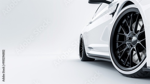 White car with black rims The car is on the right side of the picture, with a close-up of the wheel and bodywork. White background. Parked car with focus on the right rim and rear wheel.