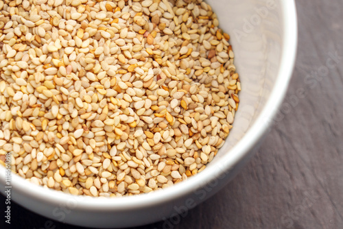 White ceramic bowl filled with raw organic sesame seeds placed on a dark wooden surface. Top view