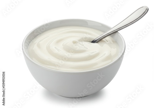 White ceramic bowl with creamy yogurt and spoon on clean white background symbolizing purity, simplicity, and healthy eating