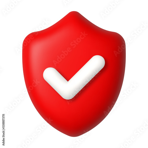 White check mark on red shield 3d icon. Security and protection concept. 3d realistic vector design element.