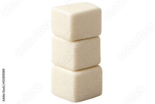 White chewing gum cubes carefully balanced vertically, stacked against transparent background