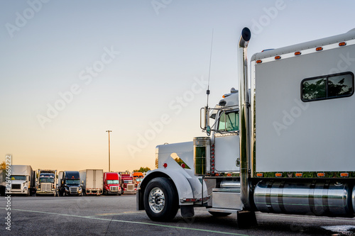 White classic big rig powerful semi truck with long sleeping compartment standing on the evening truck stop parking lot
