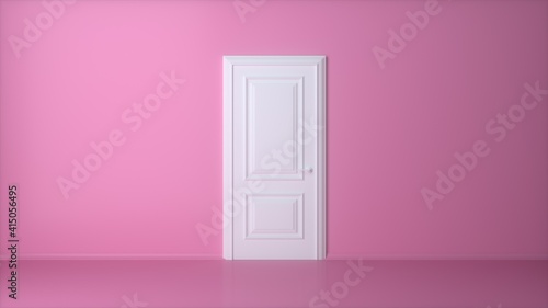 White closed door on pink background. Frame on pink Wall in the Empty Room. Interior Design Element. Design Template for Graphics. 3d render