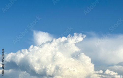 White clouds on a summer blue sky for background or wallpaper design. Majestic cumulus clouds float across the endless sky, their graceful forms painting a mesmerizing canvas of beauty and grandeur.