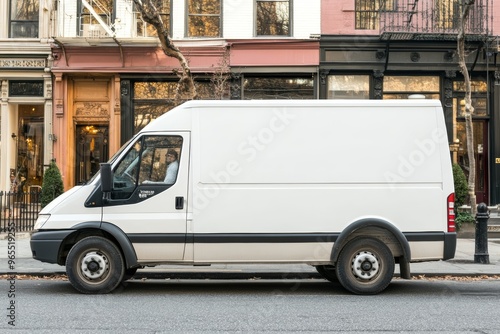 White Delivery Van Parked on a City Street, Residential Buildings and Trees in the Background.