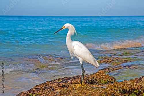White egret bird standing in shallow ocean water