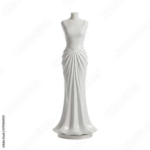 White evening gown displayed on a headless mannequin with elegant draping and a structured base isolated on a black background