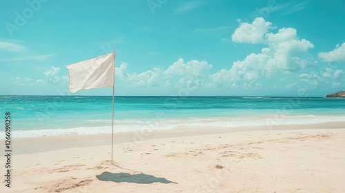White fabric flag sign billowing in the breeze on a pristine, untouched beach