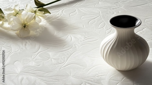 White flower and vase on a textured white background.
