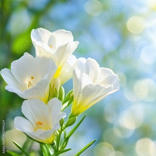 White flowers bloom, garden background, sunny day, nature beauty, greeting card