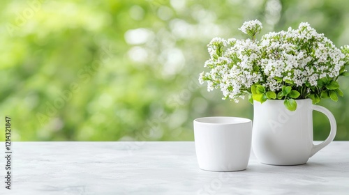 White flowers, mug, and cup on table, garden background, spring scene, home decor