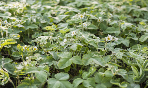 white flowers with green leaves of strawberry