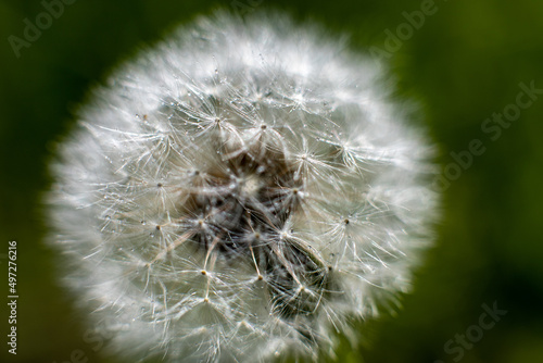 White fluffy dandelion flower with droplets of dew on green sunny background