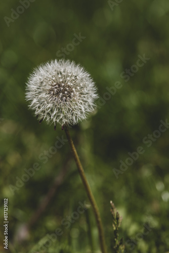 White fluffy dandelion head on green grass background. Fluffy flower. wild flowers Plant growth stage. The beauty of nature. Dandelion with a white cap close-up.