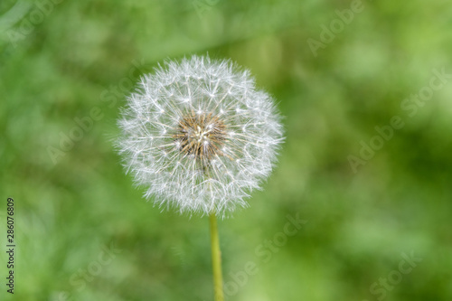 White fluffy head of ripened dandelion on a blurred background of green grass