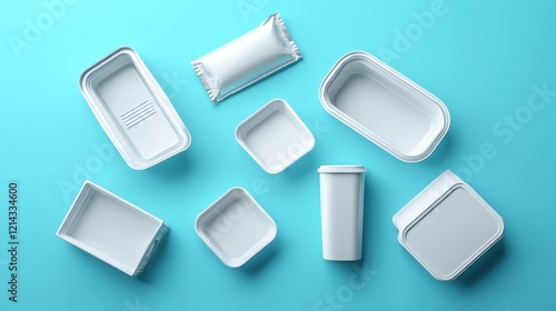 White food containers on blue background; packaging mockups