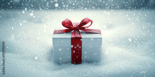 White gift box with a red ribbon bow on a snowy background, generative AI