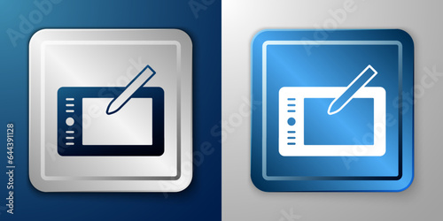 White Graphic tablet icon isolated on blue and grey background. Silver and blue square button. Vector