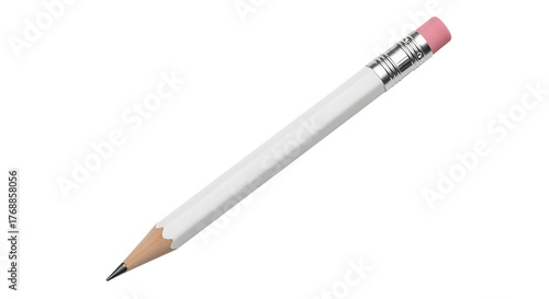 White hexagonal pencil with pink eraser and silver ferrule angled diagonally isolated on a transparent background