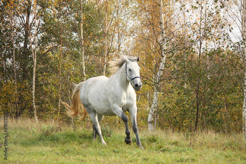 White horse galloping free in autumn