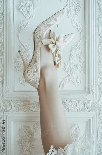 White lace heels with bows and floral patterns, highlighted by an elegant woman's leg, set against a white background with a delicate patterned frame in high-fashion photography style.