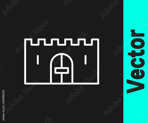 White line Medieval castle gate in a stone wall icon isolated on black background. Medieval fortress. Protection from enemies. Vector.