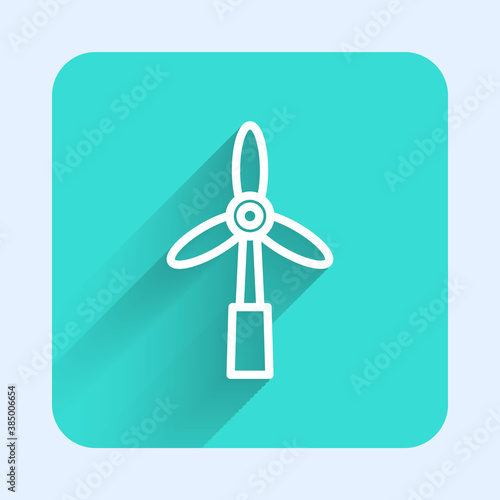 White line Wind turbine icon isolated with long shadow. Wind generator sign. Windmill for electric power production. Green square button. Vector.