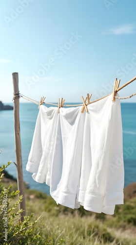White linen fabrics flutter on a rope against a vibrant coastal landscape.