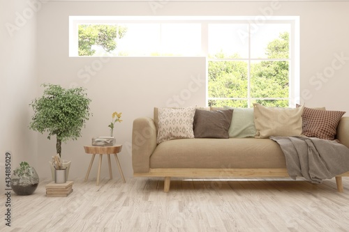 White living room with sofa and summer landscape in window. Scandinavian interior design. 3D illustration