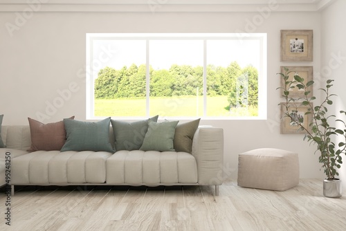 White living room with sofa and summer landscape in window. Scandinavian interior design. 3D illustration