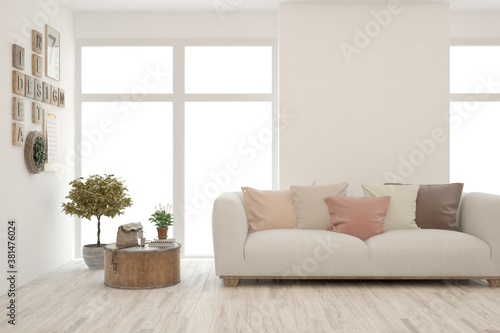 White living room with sofa. Scandinavian interior design. 3D illustration
