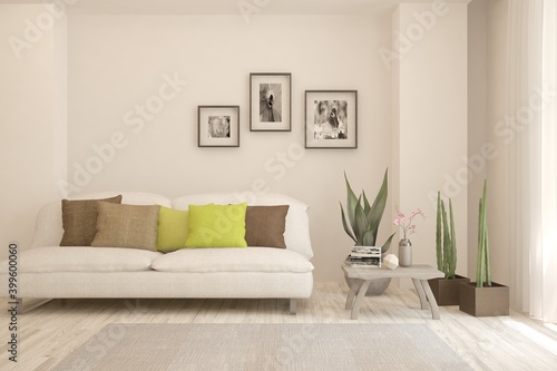 White living room with sofa. Scandinavian interior design. 3D illustration