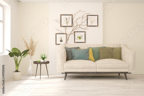 White living room with sofa. Scandinavian interior design. 3D illustration