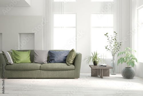 White living room with sofa. Scandinavian interior design. 3D illustration