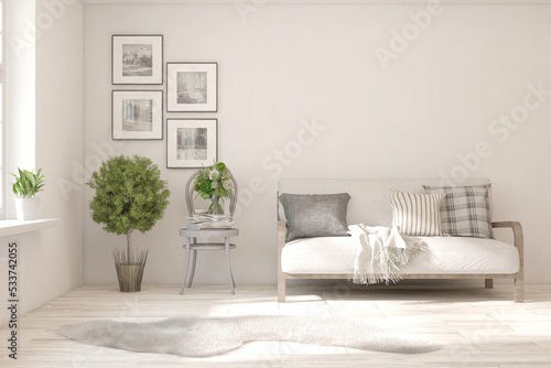 White living room with sofa. Scandinavian interior design. 3D illustration