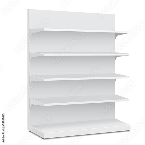 White Long Blank Empty Showcase Displays With Retail Shelves Front View 3D Products On White Background Isolated. Ready For Your Design. Product Packing. Vector EPS10