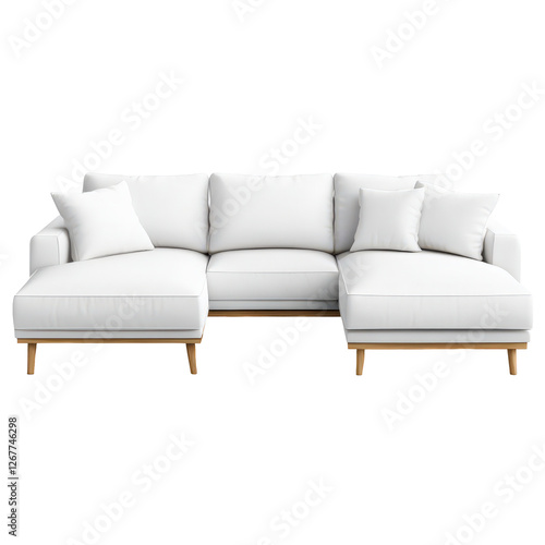 White L-shaped sectional sofa with light wood legs and white pillows.