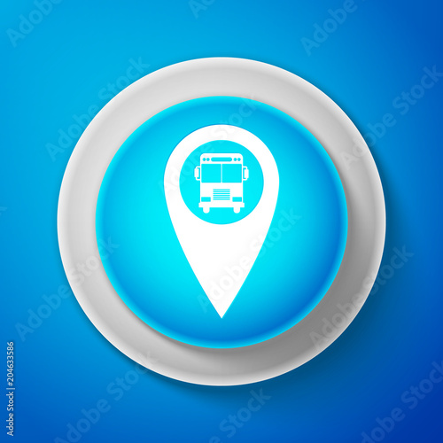 White Map pointer with bus icon isolated on blue background. Circle blue button with white line. Vector Illustration