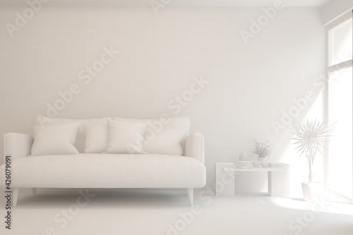 White minimalist living room with sofa. Scandinavian interior design. 3D illustration