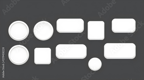 White monochrome 3D button set in different shapes. Blank glossy round, square and rectangle badges. Vector illustration. Generative AI