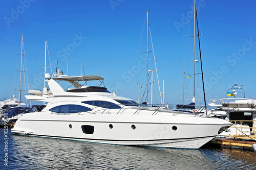 White motor yacht over harbor pier, Odessa, Ukraine